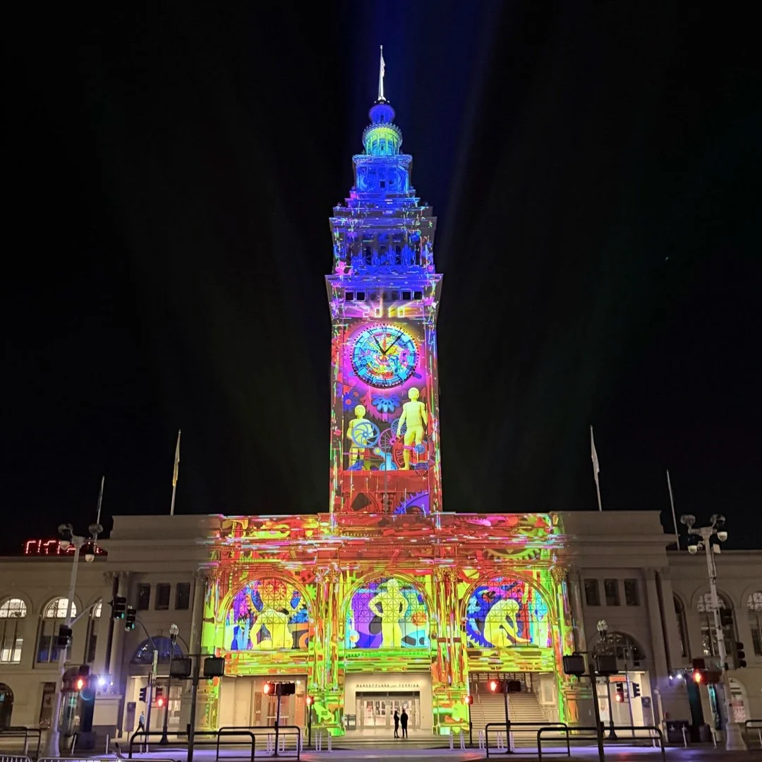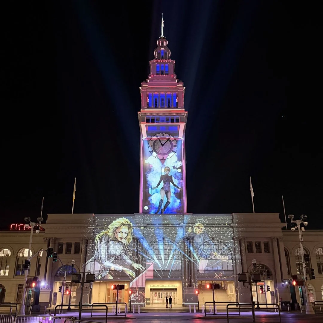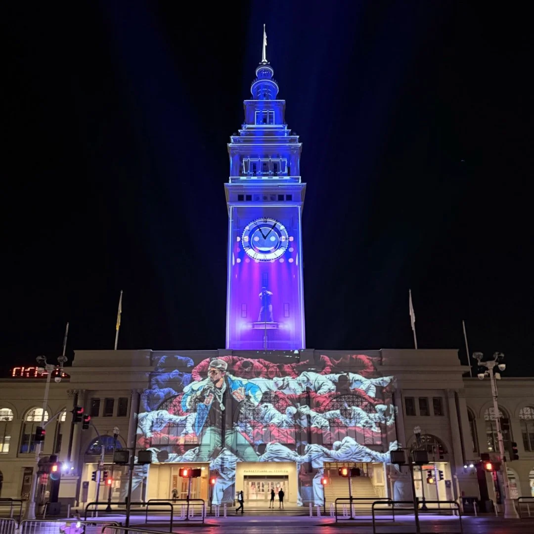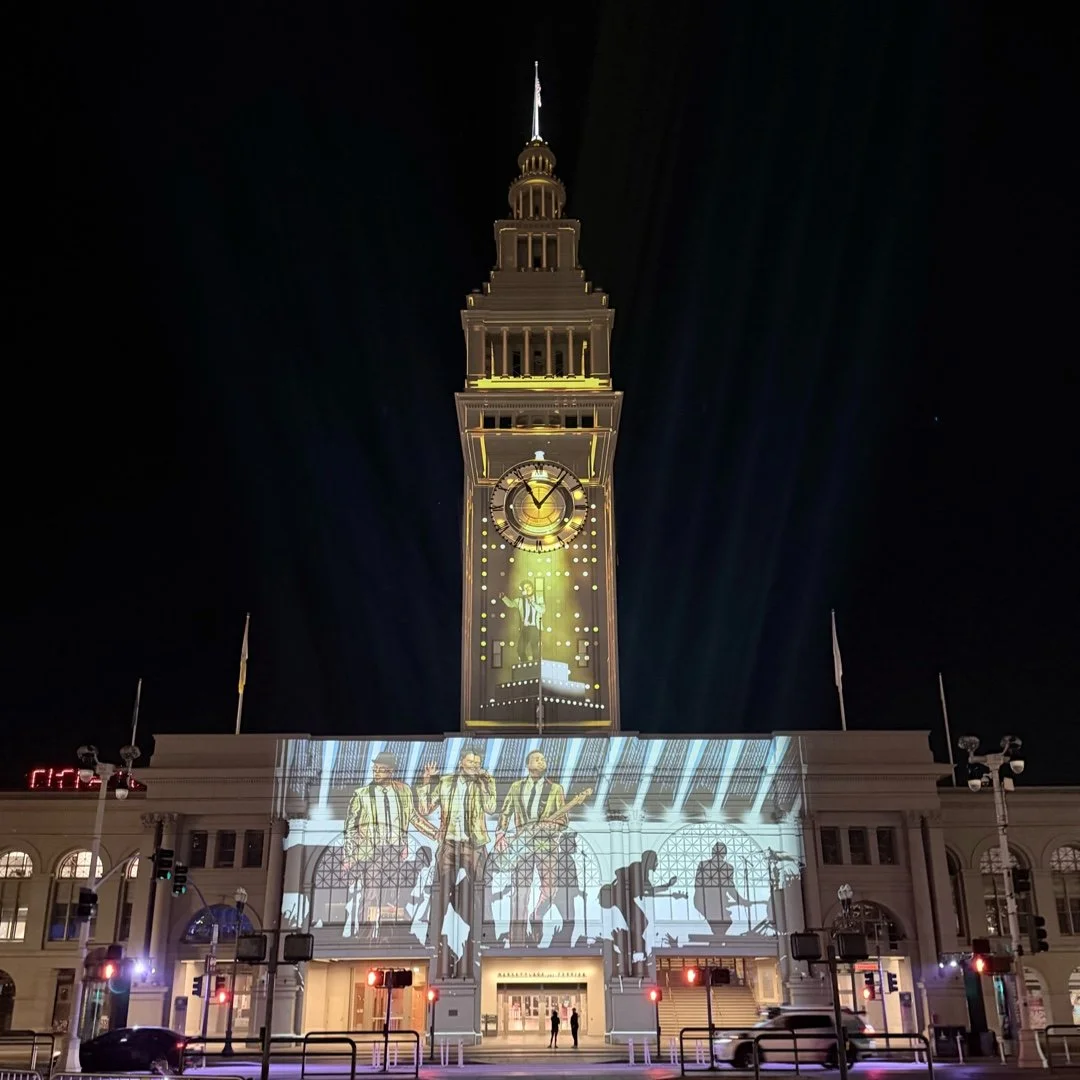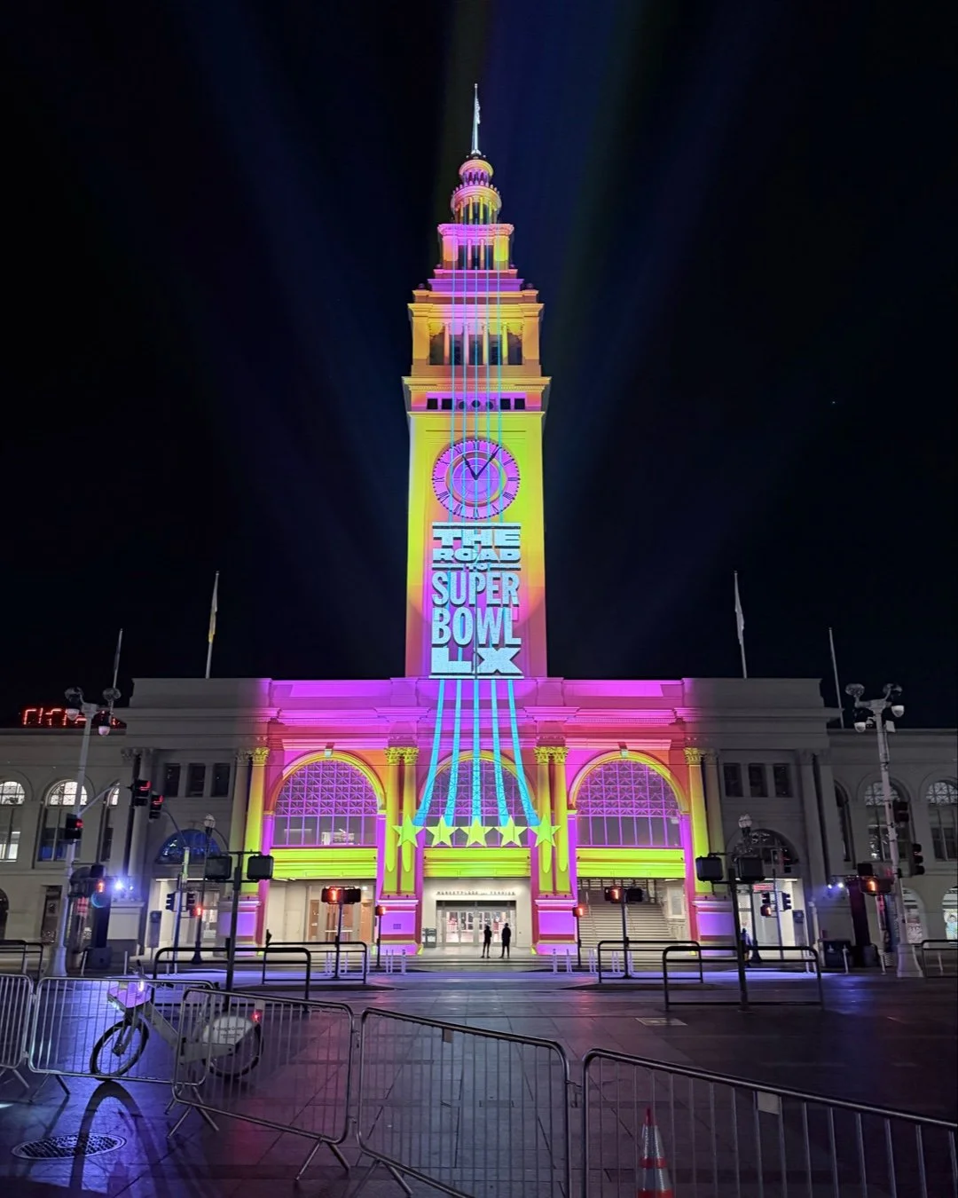 Projection mapping show on the San Francisco Harbor Building celebrating 60 years of the Super Bowl.